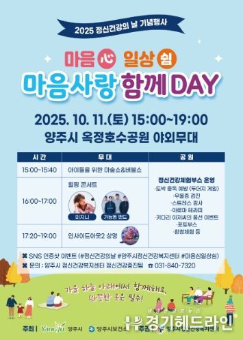 [경기헤드라인=김윤종 기자] 양주시보건소와 양주시정신건강복지센터는 정신건강의 날(10월 10일)을 맞아 시민들의 정신건강 인식 증진과 마음건강 회복을 위해 '마음(心) 일상쉼, 마음사랑 함께 데이(마음을 쉬게 하는 하루)'를 개최한다.