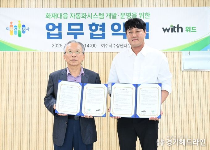 [경기헤드라인=정현수 기자] 여주도시공사는 2025년 9월 23일 위드(with)와 전기차 충전시설 안전 강화를 위한 업무협약(MOU)을 체결하고, 공용주차장 내 전기차 충전소에 위드(with)가 개발한 첨단 화재대응 자동화시스템을 시범 설치한다고 밝혔다.