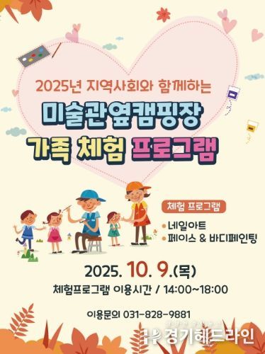 [경기헤드라인=김윤종 기자] 양주도시공사는 오는 10월 9일 양주시 미술관옆캠핑장 달빛구역에서 ‘미술관옆캠핑장 가족 체험 프로그램’을 운영한다고 밝혔다.