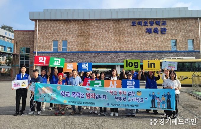[경기헤드라인=문수철 기자] 시흥시 신현동 바르게살기운동위원회와 행정복지센터 직원들은 지난 9월 26일 포리초등학교 앞에서 등굣길 학교폭력 예방 캠페인을 진행했다. 이번 캠페인은 학교 내외에서 발생할 수 있는 폭력에 대한 경각심을 높이고, 학생들에게 올바른 공동체 의식과 배려 문화를 전하기 위해 마련됐다
