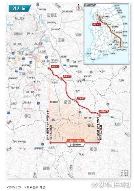 국토교통부에 따르면 안성과 용인-음성-충주를 연결하는 민자고속도로는 손익 공유형(BTO-a) 방식으로 추진되며, 총연장 약 55km, 왕복 4차로, 설계속도는 시속 110km