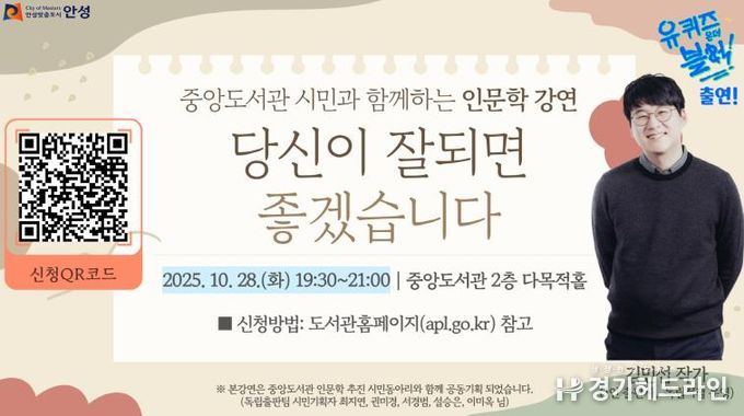 [경기헤드라인=문수철 기자] 안성시는 오는 10월 28일 저녁 7시 30분, 중앙도서관 다목적홀에서 정미소출판사 대표이자 『당신이 잘되면 좋겠습니다』의 저자 김민섭 작가를 초청해 시민 강연회를 개최한다.