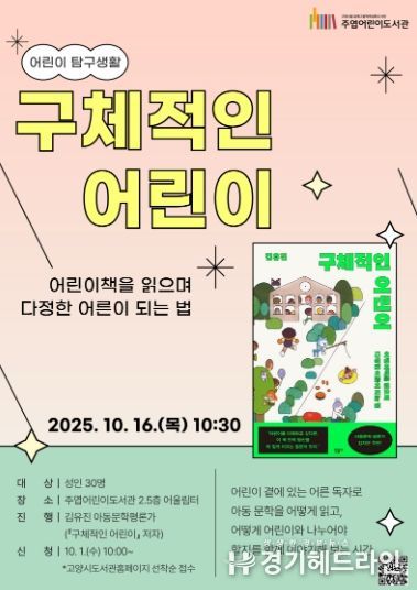 [경기헤드라인=김홍량 기자] 고양특례시 주엽어린이도서관은 오는 10월 16일과 11월 5일 성인을 대상으로 인문학 강연‘어린이 탐구생활’을 진행한다고 밝혔다.