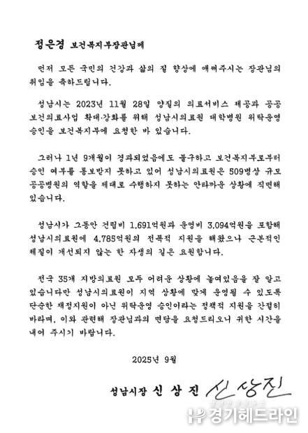 이어 “성남시의료원이 지역 상황에 맞게 운영될 수 있도록 단순한 재정지원이 아닌 위탁운영 승인이라는 정책적 지원이 반드시 필요하다”며 “이와 관련해 장관님과의 면담을 요청드린다”고 밝혔다.