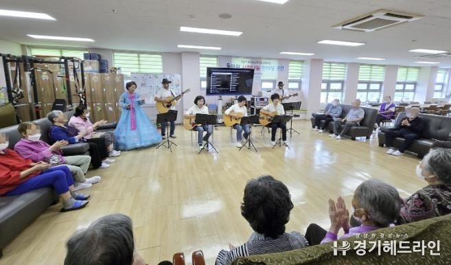 이번 공연은 금곡동 주민자치센터의 대표 동아리인 ‘소리타 장구마당’에서 흥겨운 트로트장구 공연을, 호매실동 웰빙댄스 동아리 ‘노랑나비’에서 아름다운 선율에 맞춘 웰빙댄스를, 평동 통기타 동아리 ‘청바지’에서 직접 노래를 부르며 기타연주를 하여 어르신들의 큰 호응을 이끌어냈다.