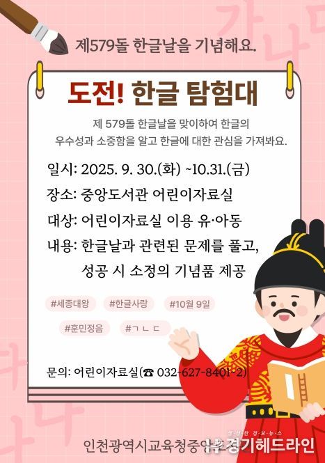 [경기헤드라인=문수철 기자] 인천광역시교육청중앙도서관은 제579돌 한글날을 맞아 9월 30일부터 10월 31일까지 어린이들이 즐겁게 한글을 배우고 도서관을 체험할 수 있는 특별행사 ‘도전! 한글 탐험대!’를 운영한다.