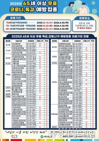 인플루엔자와 코로나19 무료 예방접종 대상자는 주소지 관계없이 전국 지정 의료기관에서 접종할 수 있고 관련 정보는 보건소 누리집 및 예방접종도우미누리집에서 확인할 수 있다.