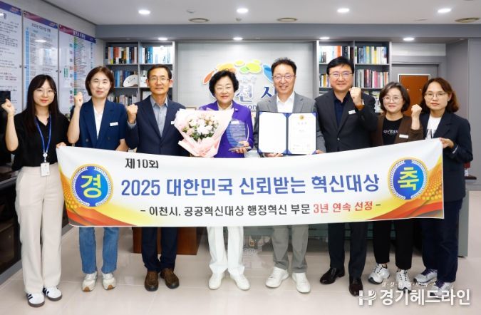 [경기헤드라인=정현수 기자] 이천시는 ‘제10회 2025년 대한민국 신뢰받는 혁신대상’에서 3년 연속 공공혁신(행정혁신부문) 대상을 수상했다고 밝혔다.