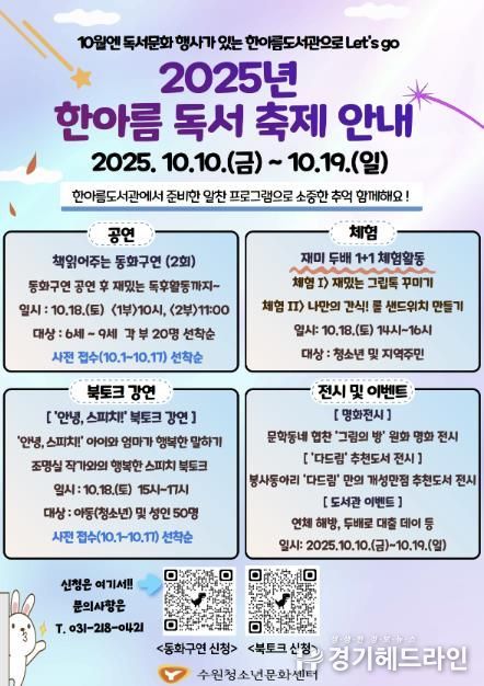 [경기헤드라인=문수철 기자] 수원시청소년청년재단 수원청소년문화센터 한아름도서관은 2025. 독서의 달을 기념하여‘한아름독서축제’를 10월 10일부터 10월 19일까지 운영한다.