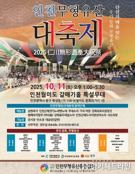 [경기헤드라인=문수철 기자] 인천광역시는 오는 10월 11일 인천 대표 관광지인 월미도 갈매기홀에서 ‘2025년 인천무형유산 대축제’를 개최한다고 밝혔다.