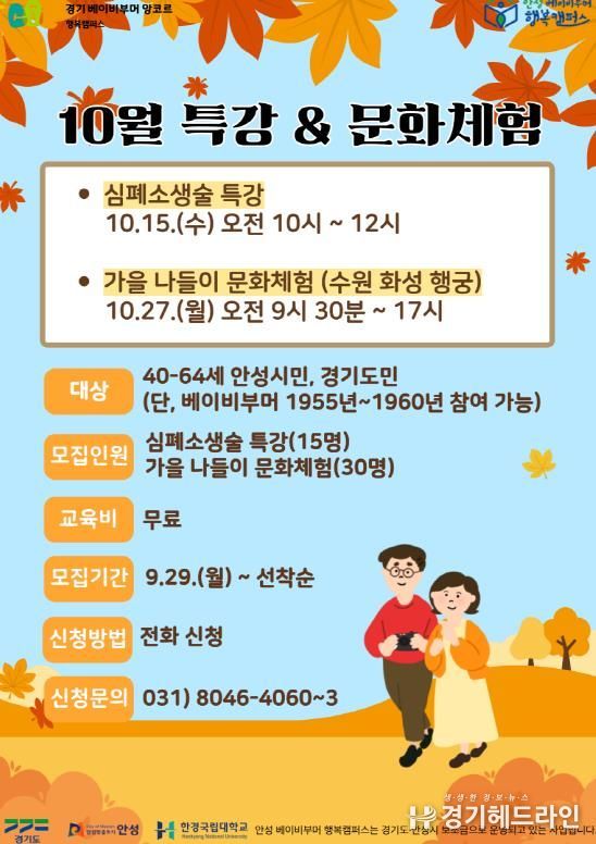 [경기헤드라인=문수철 기자] 안성 베이비부머 행복캠퍼스(한경국립대학교 평생교육원)는 오는 10월 15일부터 27일까지 중장년 안성시민(경기도민)을 대상으로 ‘10월 특강(심폐소생술) 및 문화체험(수원화성행궁)’ 프로그램을 운영한다고 밝혔다.
