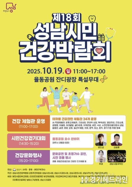 [경기헤드라인=문수철 기자] ‘제18회 성남시민 건강박람회’가 오는 10월 19일 오전 11시~오후 5시 율동공원 잔디광장에서 열린다.