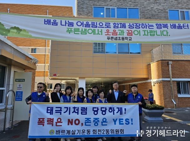 [경기헤드라인=김윤종 기자] 양주시 바르게살기운동 회천2동위원회(위원장 황영학)가 16일 푸른샘초등학교 앞에서 학생들을 대상으로 학교폭력 예방 캠페인을 실시했다.
