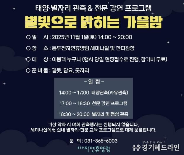 [경기헤드라인=김윤종 기자] 동두천시시설관리공단은 오는 11월 1일 동두천자연휴양림에서 가을밤 하늘을 배경으로 별자리와 행성을 함께 관측하는 '천문행사 ‘별빛으로 밝히는 가을밤’'을 개최한다.