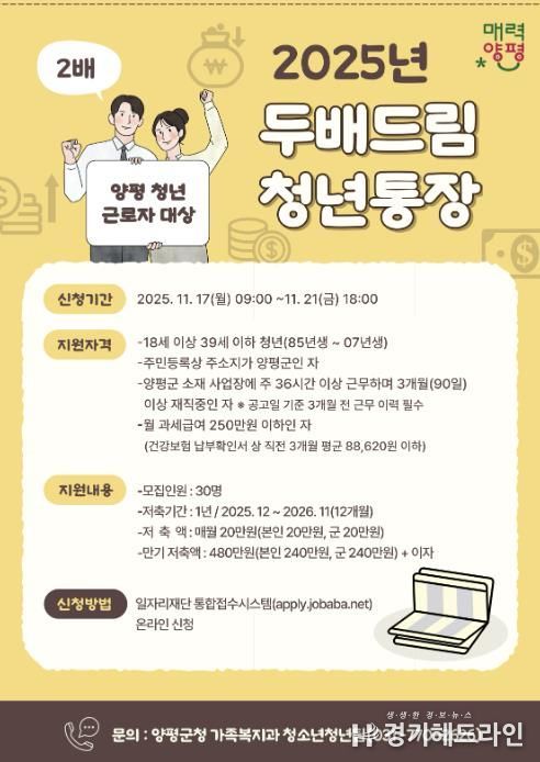 [경기헤드라인=문수철 기자] 양평군은 청년들의 자립과 미래 설계 기반 마련을 위해 ‘두배드림 청년통장’ 사업을 추진한다고 밝혔다.