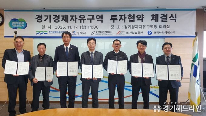 [경기헤드라인=문수철 기자] 경기경제자유구역청은 17일 경기경제청에서 평택시, 자동차부품 제조기업 3개 사와 평택 포승(BIX)지구 산업시설용지 투자협약을 체결했다.