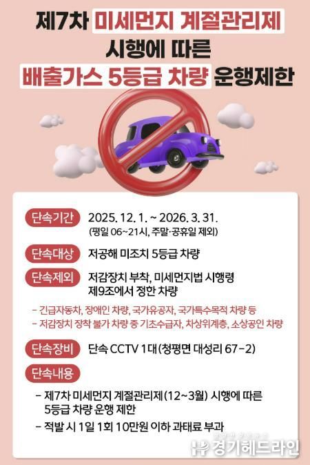 [경기헤드라인=문수철 기자] 가평군은 ‘제7차 미세먼지 계절관리제’가 시행됨에 따라 5등급 노후경유차에 대해 폐쇄회로(CC)TV를 통한 운행제한 단속을 본격 실시한다. 이에 따라 매연저감장치를 설치하지 않은 차량 소유자들에게 각별한 주의를 당부했다.