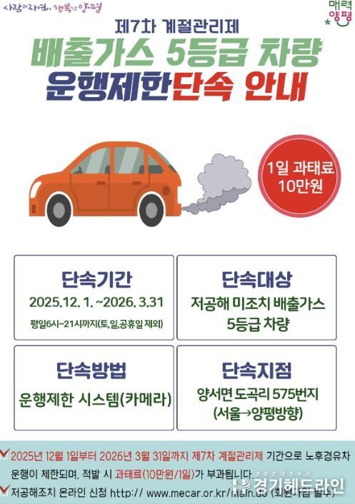[경기헤드라인=문수철 기자] 양평군(은 오는 12월 1일부터 2026년 3월 31일까지 제7차 미세먼지 계절 관리제 시행에 따라 배출가스 5등급 차량에 대한 운행 제한 단속을 시행한다고 밝혔다.