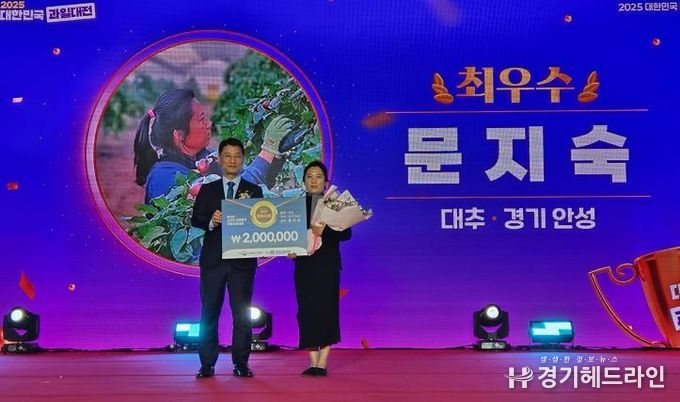 [경기헤드라인=문수철 기자] 농림축산식품부 주최, 한국과수농협연합회 주관으로 하는 ‘2025 대한민국 과일산업대전 대표과일선발대회’에서 안성시가 2023년부터 대추부문에서 최우수상, 우수상을 수상하여 3년 연속 대추부문 최고자리에 올랐다. 수상자로 문지숙 대표가 최우수상(농림축산식품부장관상)으로 선정됐고, 조재곤 대표가 우수상(산림청장상)으로 선정됐다.
