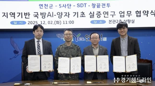 [경기헤드라인=김윤종 기자] 연천군은 지난 2일 군청 상황실에서 육군 제5보병사단, SDT(주), 사단법인 창끝전투와 함께 AI 대전환 시대에 대응하고 지역의 새로운 성장 동력을 확보하기 위한 ‘지역기반 국방 AI·양자 기초 실증연구’ 업무협약을 체결했다고 밝혔다.