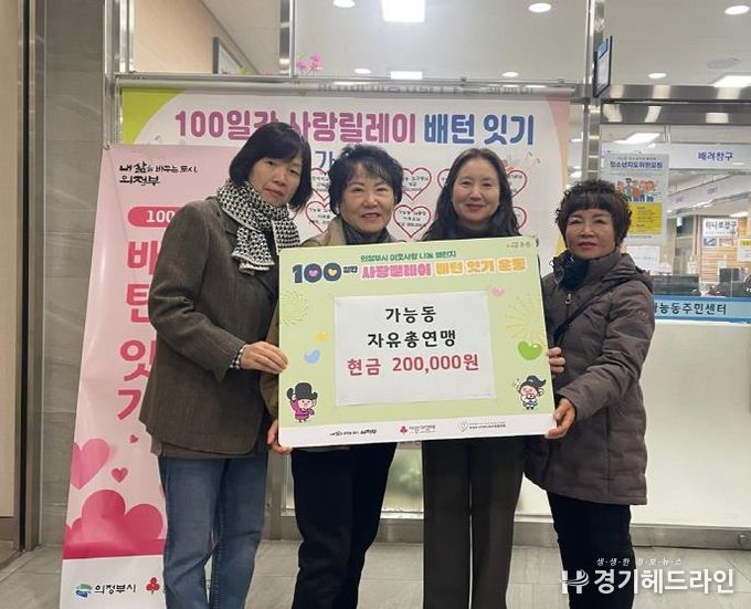 [경기헤드라인=문수철 기자] 의정부시 가능동주민센터는 12월 16일 가능동 자유총연맹이 관내 취약계층을 돕기 위해 성금 20만 원을 기탁하며 ‘100일간 사랑릴레이 배턴 잇기’에 참여했다고 밝혔다.