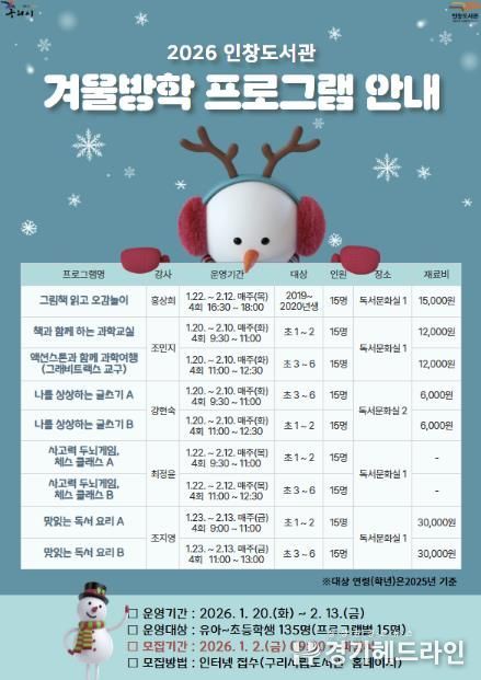 [경기헤드라인=문수철 기자] 구리시는 겨울방학을 맞은 어린이들을 위해 지역 내 공공도서관 4곳에서 독서를 기반으로 한 창의적이고 체험 중심의 다양한 프로그램을 운영한다.