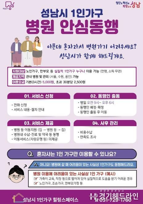 [경기헤드라인=문수철 기자] 성남시는 ‘1인 가구 병원 안심 동행 서비스’ 추진을 위해 전문 인력을 기존 4명에서 5명으로 늘렸다고 22일 밝혔다.