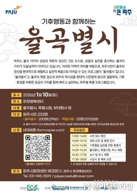 파주시환경센터 에코온 관계자는 “율곡별시는 가족과 아이들이 함께 참여하며 기후행동을 자연스럽게 경험하는 문화축제”라며 “미래세대인 청소년이 주체가 되어 기후 위기 대응의 가치를 배우고 실천으로 이어갈 수 있는 계기가 되길 바란다”라고 밝혔다.