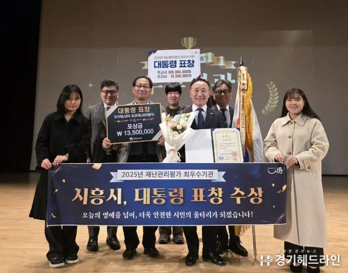 [경기헤드라인=문수철 기자] 시흥시는 행정안전부가 주관한 ‘2025년 재난관리평가’에서 최우수기관으로 선정돼 지난 12월 22일 정부세종청사 국토교통부 대강당에서 열린 시상식에서 대통령 표창을 받고 특별교부세 3억 원과 포상금 1,350만 원을 확보했다.