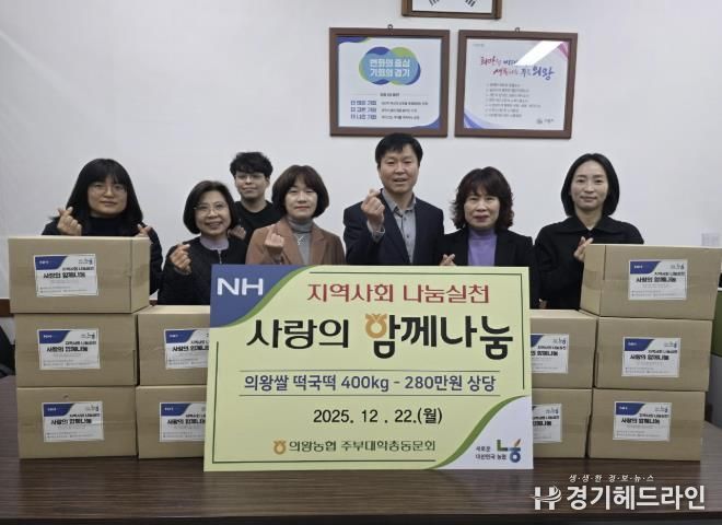 [경기헤드라인=문수철 기자] 의왕농협 주부대학총동문회는 12월 22일, 회원들의 뜻을 모아 떡국떡 400kg(280만원 상당)을 부곡동주민센터에 기탁하며 어려운 이웃을 위한 나눔을 실천했다.