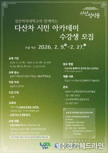 모집 인원은 총 25명으로, 남양주시 평생학습포털 ‘다산서당’을 통해 선착순으로 접수받는다. 교육비는 총 60만 원 상당이나 시의 교육 지원을 통해 10만 원의 자부담만으로 참여할 수 있다. 남양주시 거주 고등학교 졸업자 이상 시민이면 누구나 신청 가능하다.