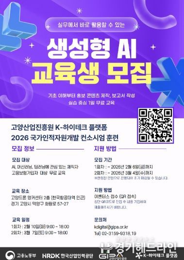 [경기헤드라인=김홍량 기자] 고양산업진흥원 산하 K-하이테크플랫폼 지원단이 ‘2026년 실무에서 바로 쓰는 생성형 AI 과정’ 교육생을 모집한다.