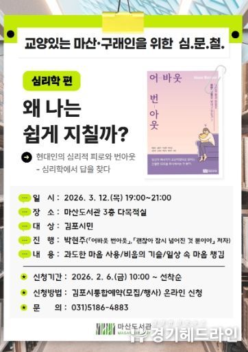 [경기헤드라인=문수철 기자] 김포시 마산도서관은 심리적 피로와 번아웃을 주제로 한 인문교양 강연 '왜 나는 쉽게 지칠까?'를 오는 3월 12일 오후 7시부터 9시까지 마산도서관 3층 다목적실에서 운영한다.