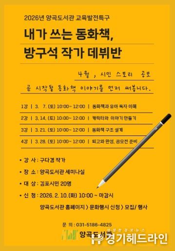 [경기헤드라인=문수철 기자] 김포시 양곡도서관은 오는 3월 7일부터 3월 28일까지 매주 토요일, 시민을 대상으로 한 그림책 글쓰기 수업 '내가 쓰는 동화책, 방구석 작가 데뷔반'을 운영한다.