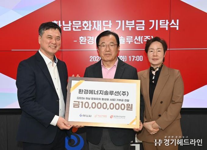 [경기헤드라인=문수철 기자] (재)하남문화재단은 2월 4일, 하남시청에서 환경에너지솔루션㈜으로부터 문화자치 활성화를 위한 기부금 1천만 원을 전달받았다고 밝혔다. 이날 기부식에는 이현재 하남시장을 비롯해 기업 및 재단 관계자들이 참석해 지역 상생과 ESG 실천의 의미를 공유했다.