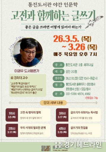 참여를 원하는 경우 오는 2월 10일 오전 10시부터 통진도서관 누리집 또는 전화로 신청할 수 있으며, 고전과 글쓰기에 관심있는 성인 20명을 선착순으로 모집한다.