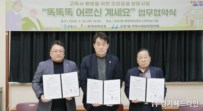 [경기헤드라인=문수철 기자] 군포시는 2월 26일 군포1동 행정복지센터에서 hy(구 한국야쿠르트), 군포1동 지역사회보장협의체와 함께 취약계층 독거노인 안부 확인을 위한 ‘똑똑똑 어르신 계세요?’ 업무 협약을 체결했다.