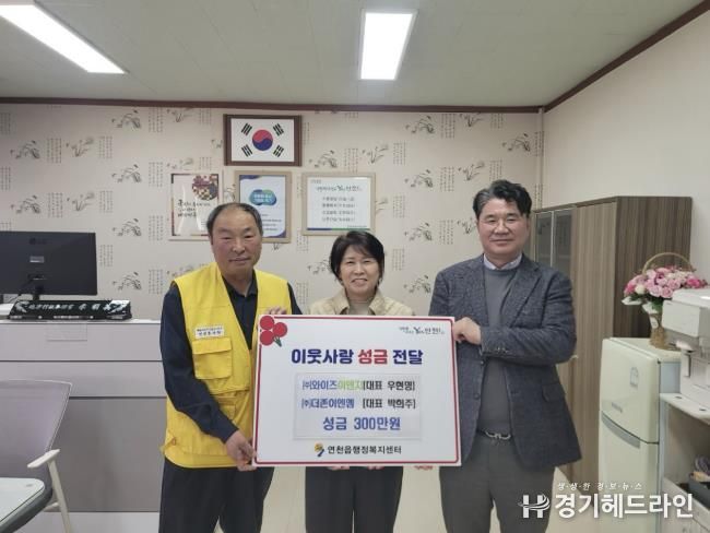 [경기헤드라인=김윤종 기자] 연천군 소재 ㈜와이즈이앤지와 ㈜더존이엔엠은 지난 9일 연천읍 행정복지센터를 방문해 관내 어르신들을 위한 경로잔치 준비에 써달라며 성금 300만원을 기탁했다.