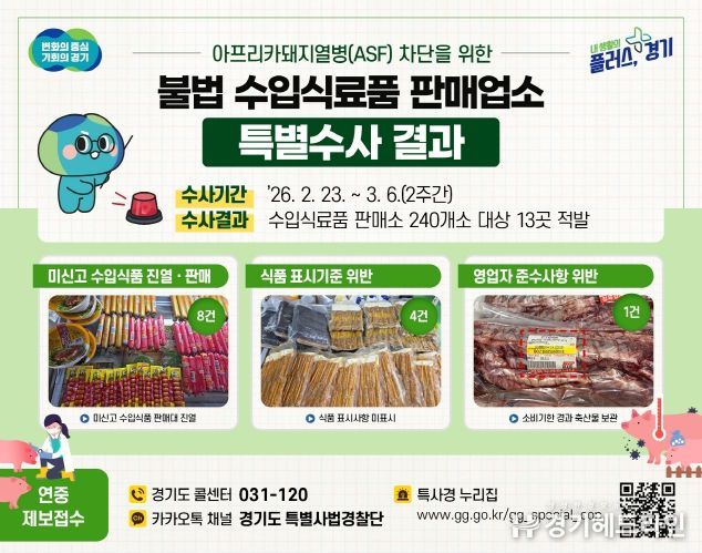 [경기헤드라인=문수철 기자] 경기도 특별사법경찰단은 아프리카돼지열병(ASF)의 국내 유입·확산 방지를 위해 수입식료품 판매업소를 수사한 결과, 미신고 수입식품 판매 등 총 13건을 적발했다고 11일 밝혔다.