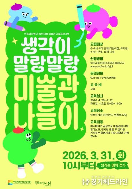 [경기헤드라인=정현수 기자] 여주세종문화관광재단은 유아를 대상으로 하는 미술관 교육프로그램 '생각이 말랑말랑, 미술관 나들이'를 오는 4월부터 10월까지 아트뮤지엄 려에서 운영한다고 밝혔다.