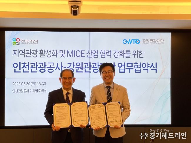 [경기헤드라인=문수철 기자] 인천관광공사는 강원관광재단(대표 최성현)과 30일 인천관광공사 회의실에서 ‘관광 및 마이스 산업 활성화와 지역 상생 협력강화를 위한 업무협약’을 체결하고 협력 체계를 강화한다고 밝혔다.