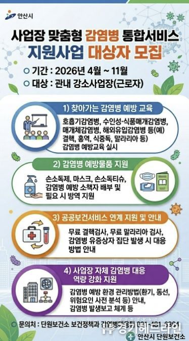 [경기헤드라인=문수철 기자] 안산시 단원보건소는 관내 강소사업장을 대상으로 ‘사업장 맞춤형 감염병 통합서비스 지원사업’ 대상자를 모집한다고 31일 밝혔다.