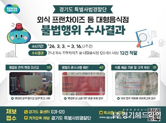 [경기헤드라인=문수철 기자] 경기도 특별사법경찰단은 지난 3월 3일부터 16일까지 도내 외식 프랜차이즈 등 대형음식점 120개소를 대상으로 집중 수사를 실시한 결과 영업장 면적 변경 미신고 및 영업자 준수사항 위반 등 총 12건의 불법행위를 적발했다.