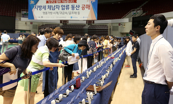 ▲ 지난 6월 안양실내체육관에서 열린 ‘지방세 체납자 압류 동산 공매’ 현장 모습