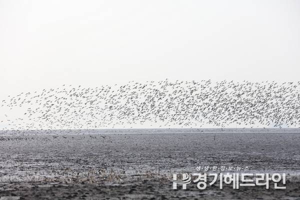 ▲ 매향리 갯벌 일대 철새 군무 모습[경기헤드라인=김홍범 기자] 멸종 위기 철새들의 휴식처인 화성습지가 세계적인 철새보호기구‘동아시아-대양주 철새이동경로 파트너십(EAAFP)’에 등재됐다.