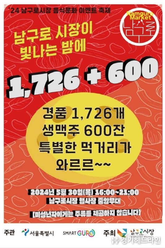 [경기헤드라인=문수철 기자] 서울 남구로시장은 오는 5월 30일(목) 오후 4시부터 9시까지 음식문화이벤트축제(주관 서울시,구로구, 주최 남구로시장)를 개최한다고 전했다. 이번 음식문화축제에는 다양한 먹거리와 푸짐한 경품, 신나는 무대 공연이 펼쳐질 예정이다.