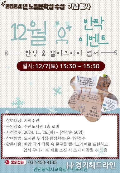 [경기헤드라인=문수철 기자] 인천광역시교육청주안도서관에서는 한강 작가의 노벨문학상 수상을 기념하여 지역주민 대상 캘리그라피 행사를 진행한다.