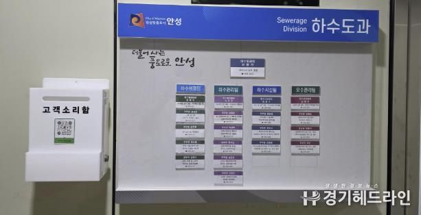 [경기헤드라인=문수철 기자] 안성시 하수도 공기업이 시민 의견 수렴 창구인 ‘고객소리함’을 설치하고 본격 운영에 들어갔다. 하수도 공기업은 이번 조치를 통해 청렴·소통·ESG(환경·사회·지배구조) 경영을 강화한다는 방침이다.