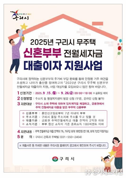 [경기헤드라인=문수철 기자] 구리시는 관내 무주택 신혼부부를 대상으로 '2025년 무주택 신혼부부 전월세 자금 대출이자 지원사업'을 오는 9월 15일부터 시행한다고 밝혔다.