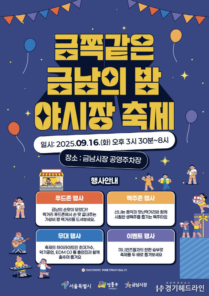 [경기헤드라인=문수철 기자] 서울 성동구 금남시장이 2025년 9월 16일(화) 오후 3시 30분부터 8시까지 특별한 가을밤 축제의 장으로 변신한다.